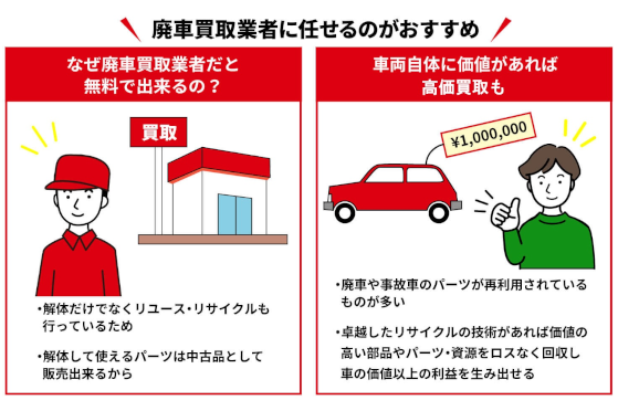 廃車買取専門業者に依頼すれば、これまで説明した面倒な手続きから引き取りまで全て行ってくれますし、費用は無料で一切かかりません。