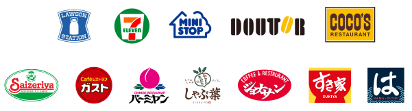 セブンイレブン、ローソン、ミニストップ、セイコーマート、ポプラ、サイゼリヤ、ガスト、バーミヤン、しゃぶ葉、ジョナサン、夢庵、はま寿司、ココス、ドトール、エクセルシオール カフェ、かっぱ寿司など
